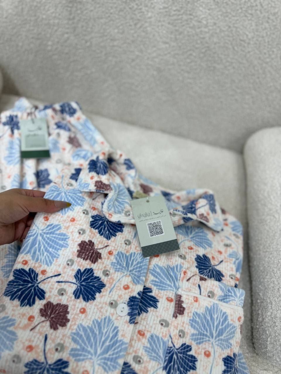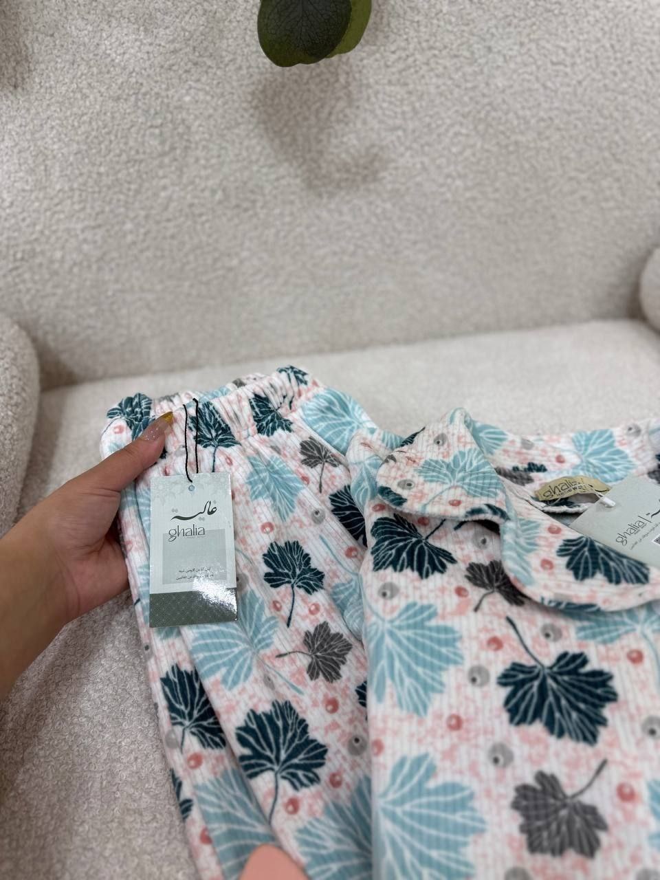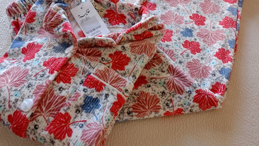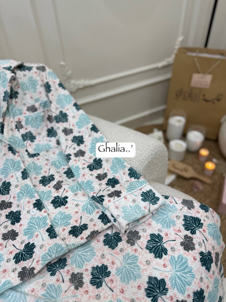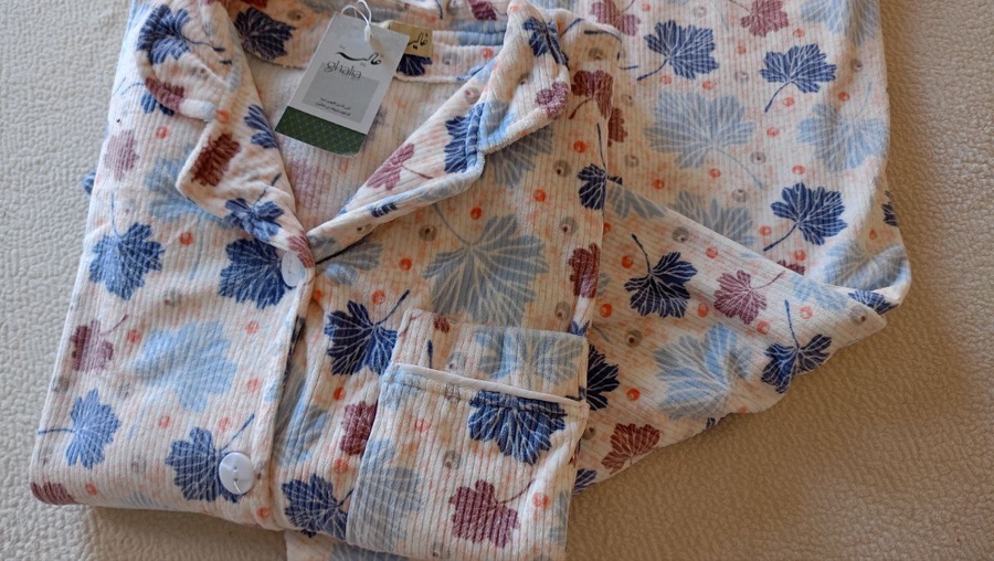 بجامة بزراير ببرنت ورق شجر بتصميم مبهج ولا أروع، متوفرة بثلاثة ألوان رائعة ستضيف لمسة من المرح إلى خزانة ملابسك. مع تشطيب فاخر وشغل بييهات مذهل على الجيب والكم، هذه البجامة مصنوعة من خامة هايدي مستورد مبطن ستجعلك تشعر بالراحة والأناقة في كل لحظة.