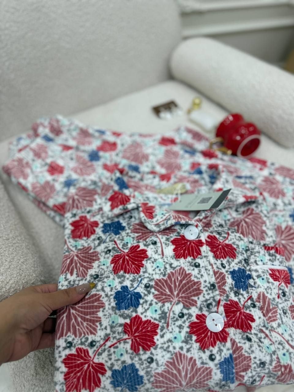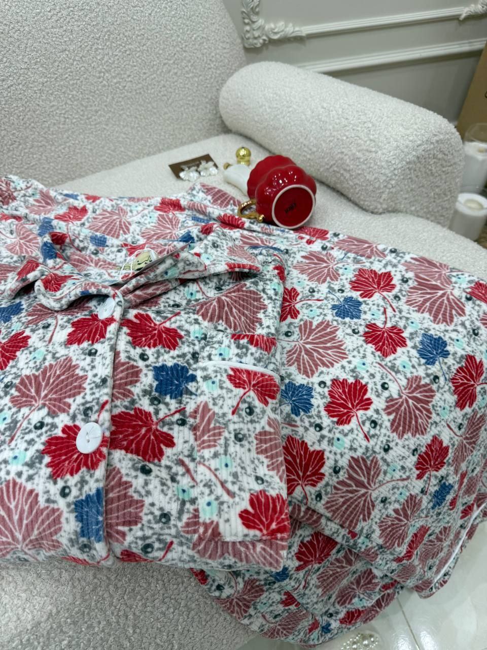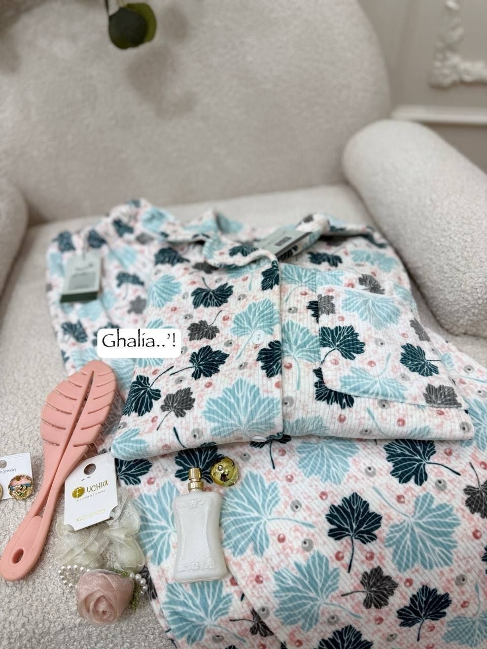 بجامة بزراير ببرنت ورق شجر بتصميم مبهج ولا أروع، متوفرة بثلاثة ألوان رائعة ستضيف لمسة من المرح إلى خزانة ملابسك. مع تشطيب فاخر وشغل بييهات مذهل على الجيب والكم، هذه البجامة مصنوعة من خامة هايدي مستورد مبطن ستجعلك تشعر بالراحة والأناقة في كل لحظة.