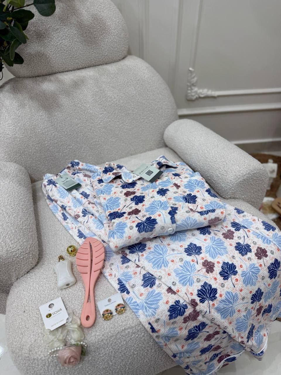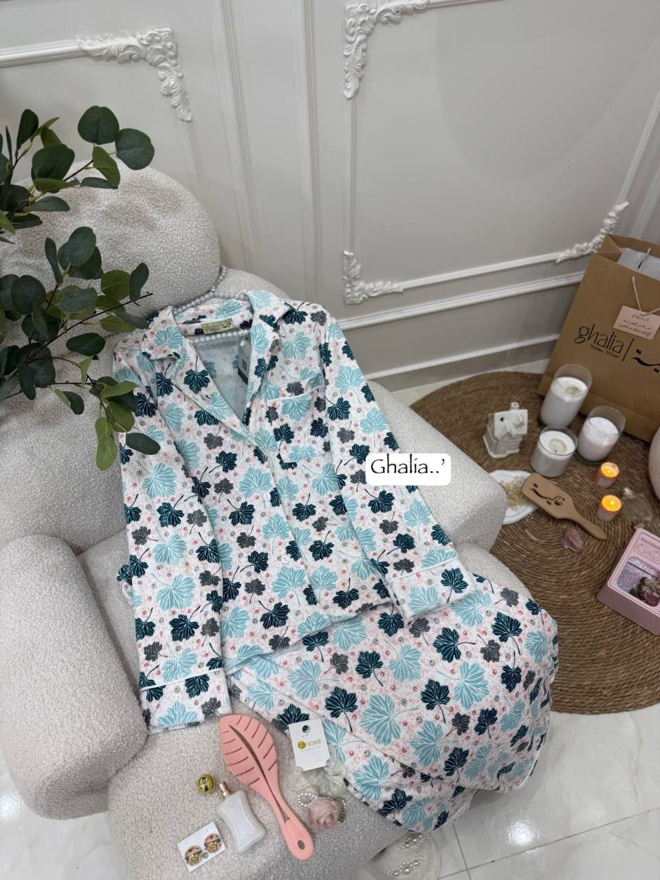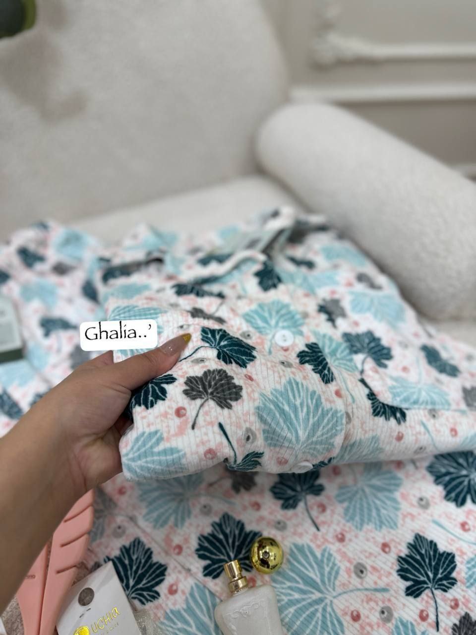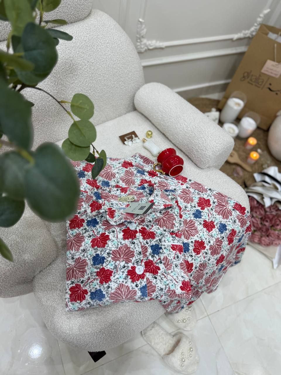 بجامة بزراير ببرنت ورق شجر بتصميم مبهج ولا أروع، متوفرة بثلاثة ألوان رائعة ستضيف لمسة من المرح إلى خزانة ملابسك. مع تشطيب فاخر وشغل بييهات مذهل على الجيب والكم، هذه البجامة مصنوعة من خامة هايدي مستورد مبطن ستجعلك تشعر بالراحة والأناقة في كل لحظة.